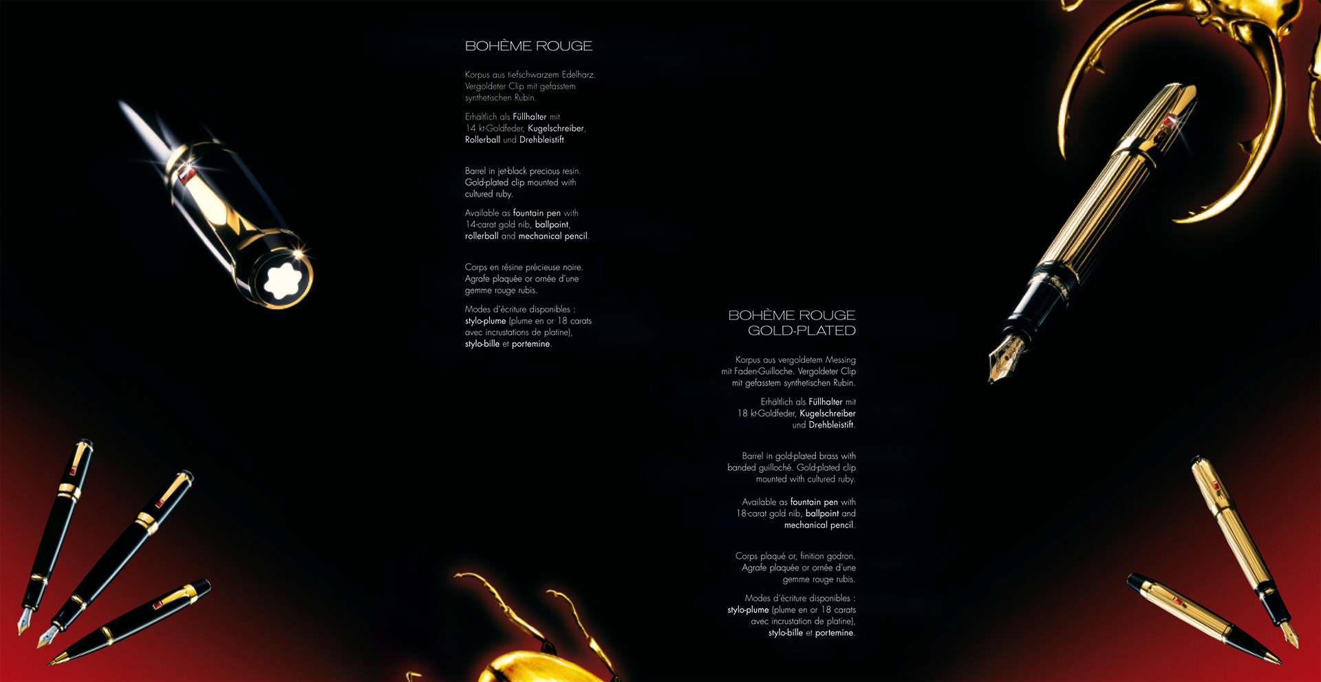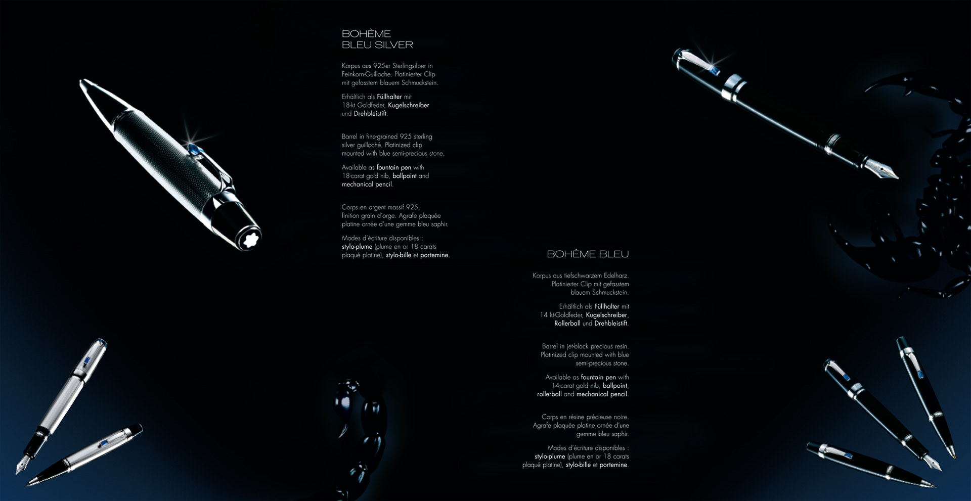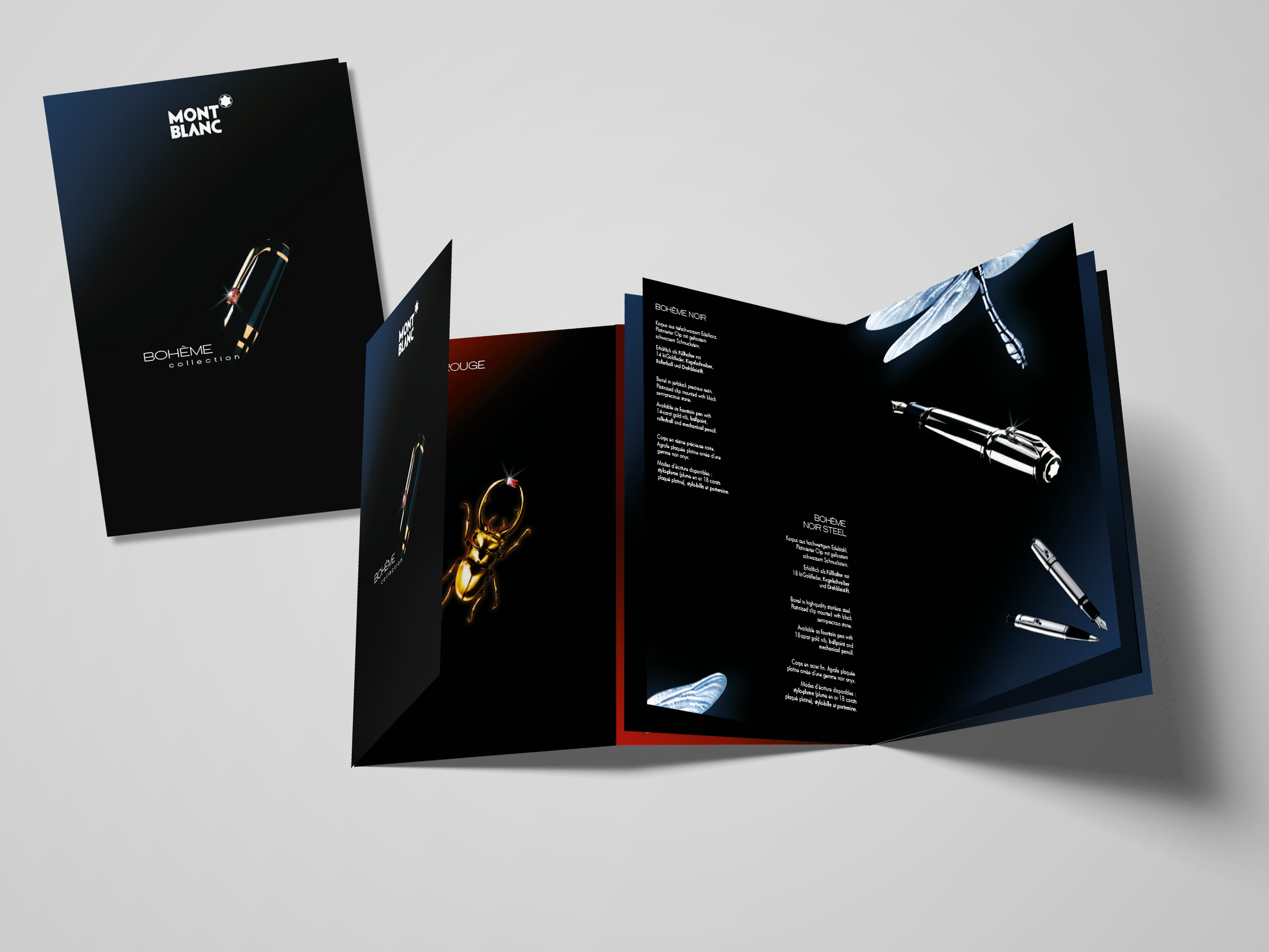 Verschiedene Broschüren und Verpackungen für Special Editions von Montblanc. Bohéme, Wuti, Sakura, Solitaire und viele mehr. Entwicklung von Keyvisuals und Mini-Kampagnen.