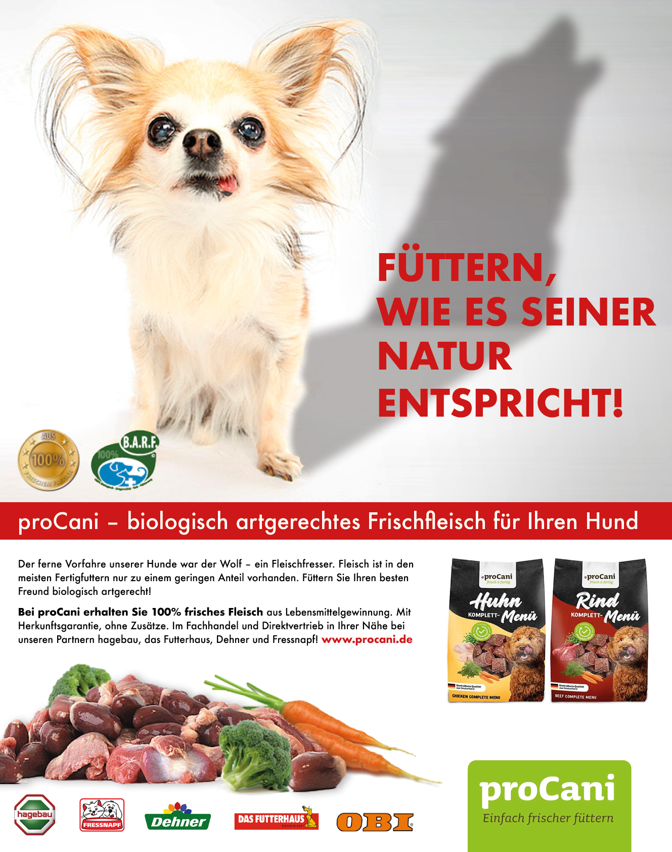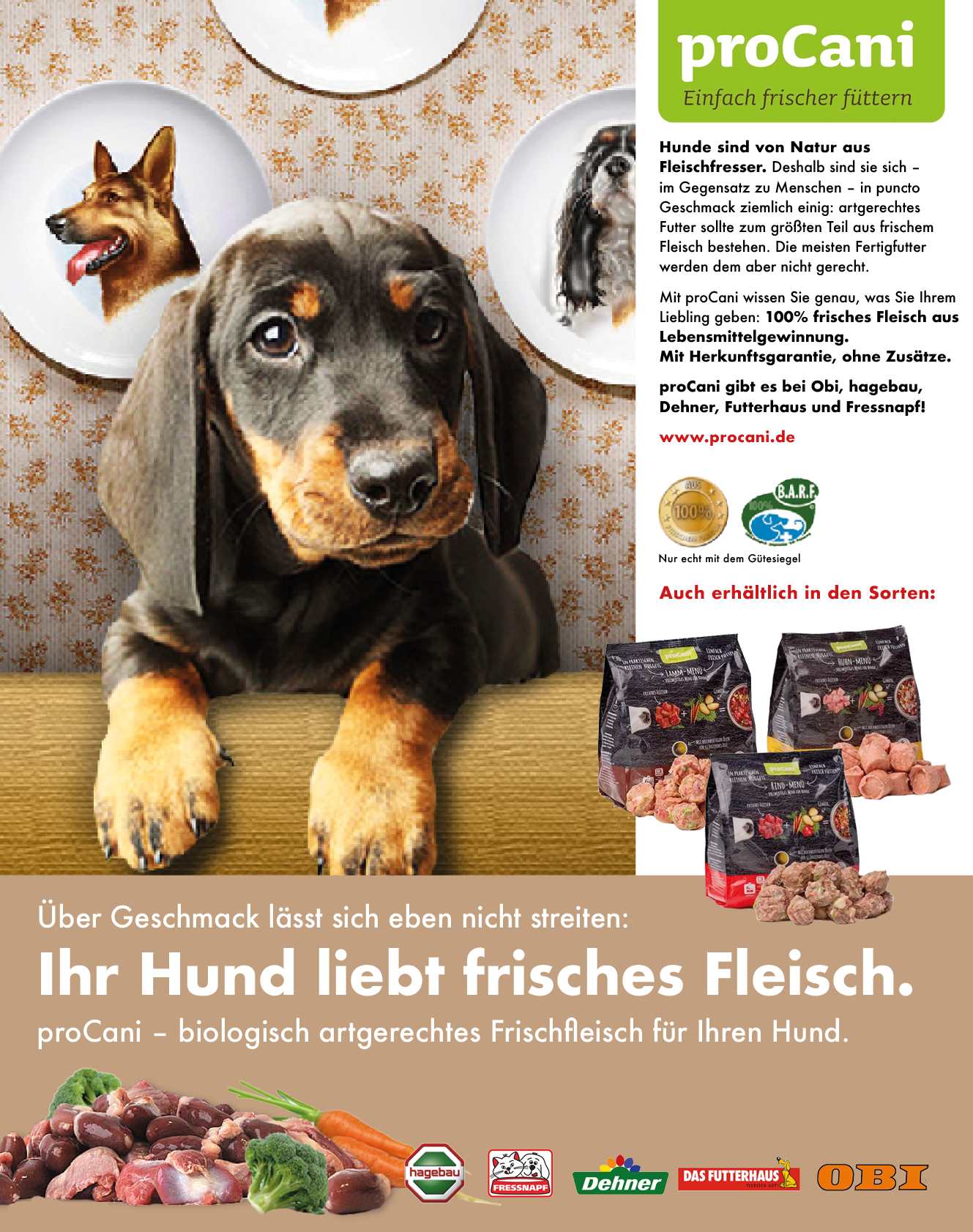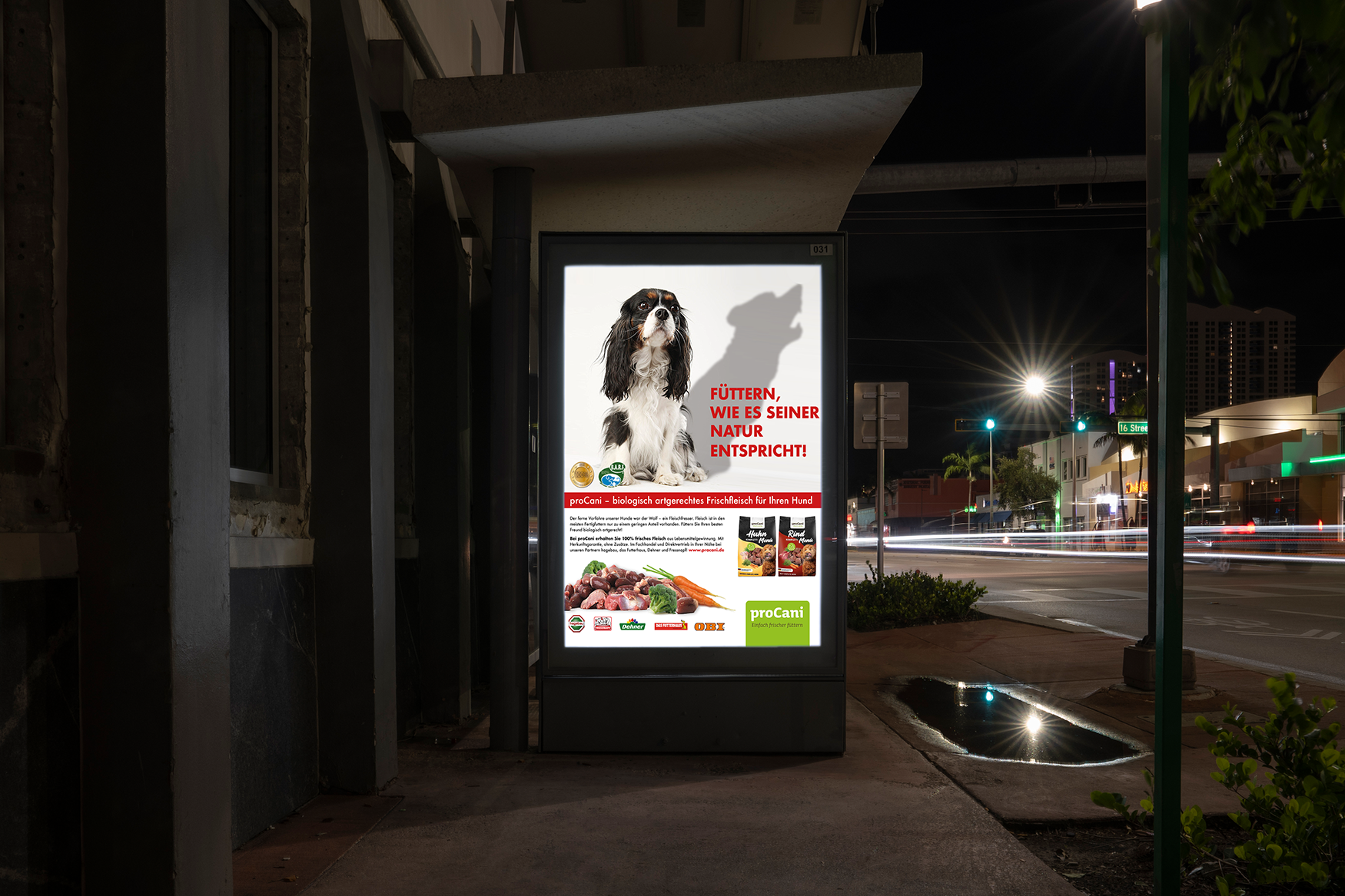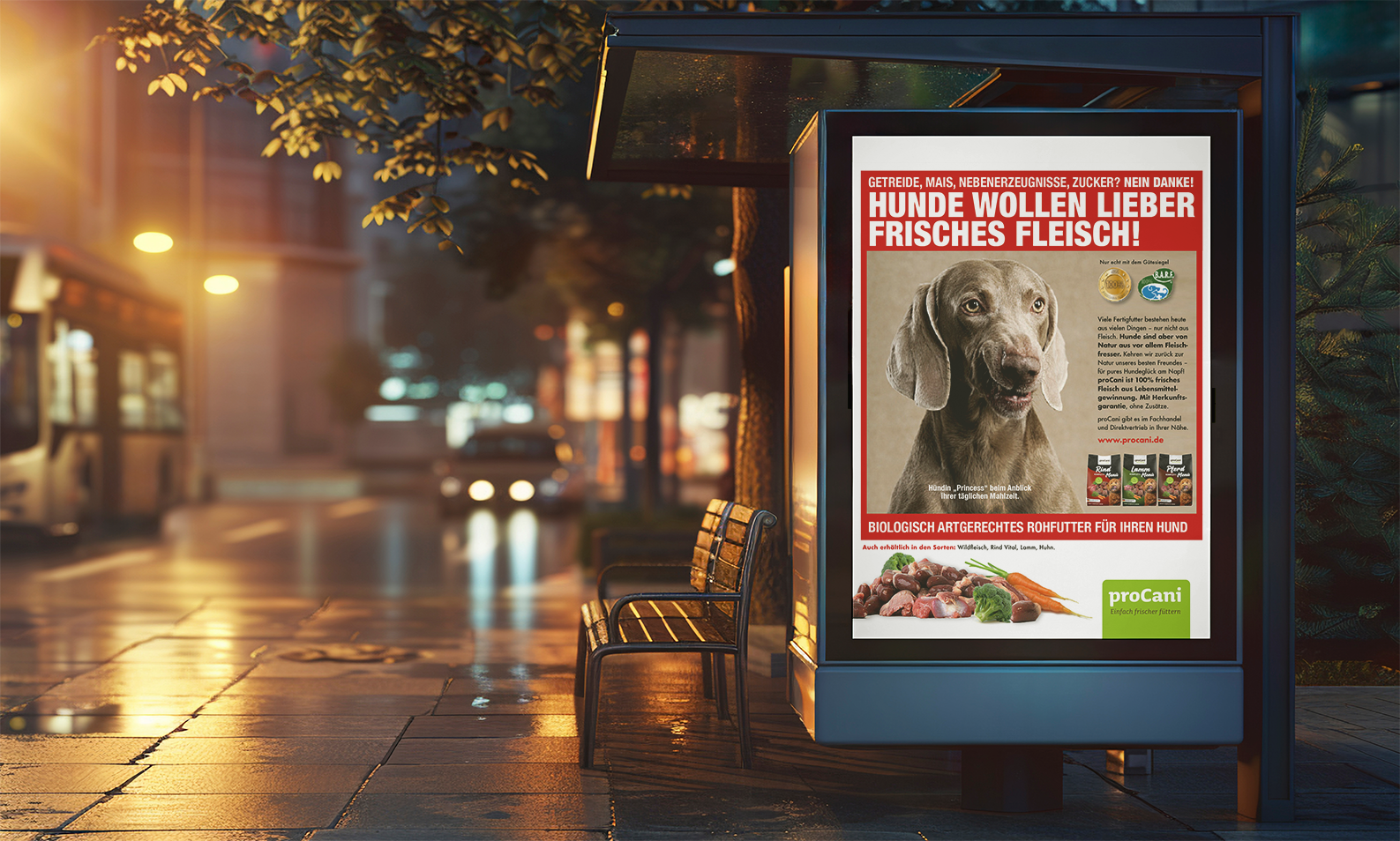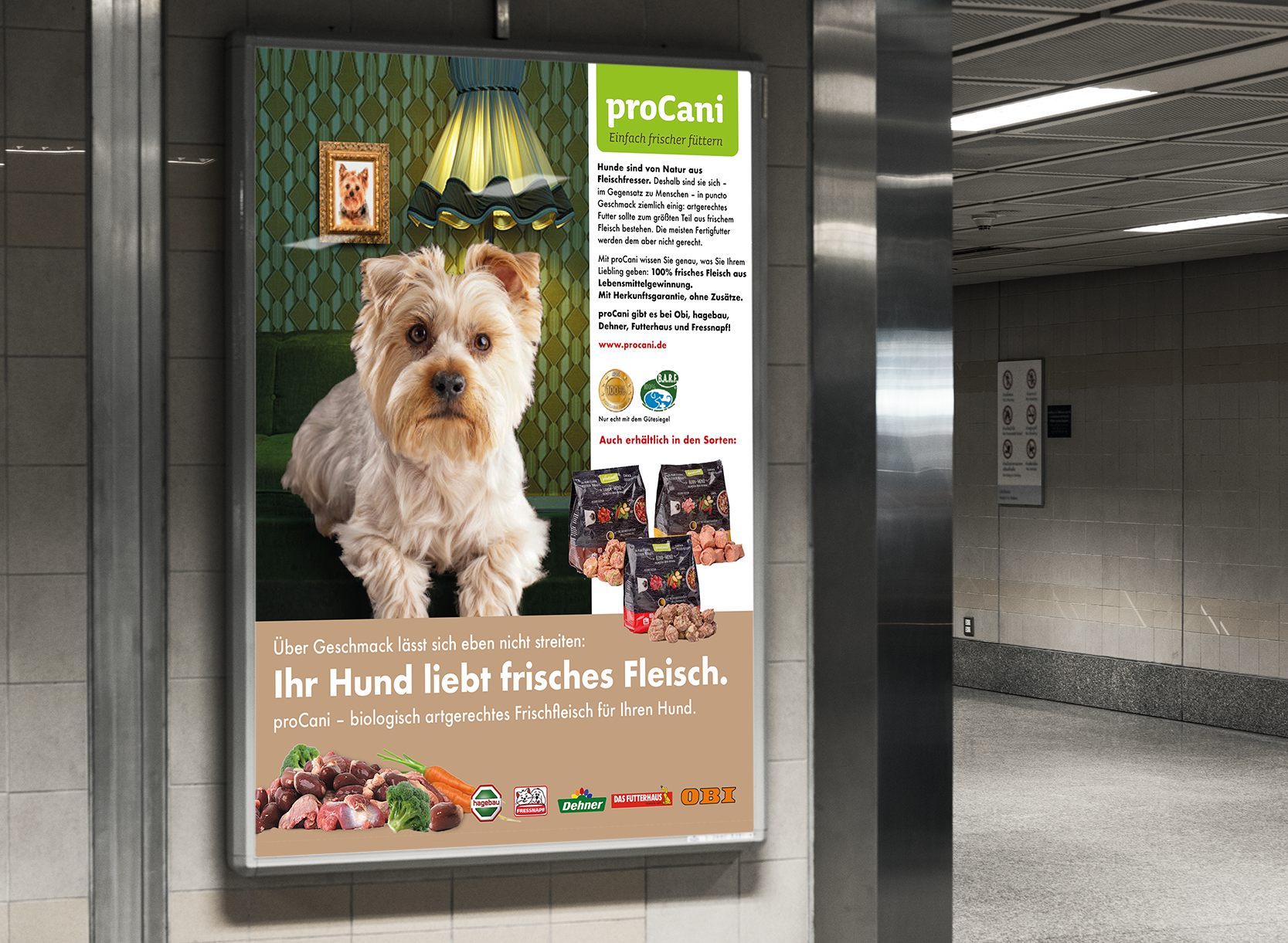 Entwicklung einer Produktkampagne für das hochwertige Tierfutter proCani mit dem Fokus auf OOH-Werbung und Anzeigen in Zeitschriften und Magazinen. Entwicklung verschiedener Tonalitäten, Look & Feel.